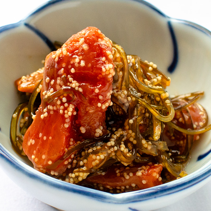 鮭と昆布和え¥864鮭と昆布を甘口しょうゆで漬け込みました。